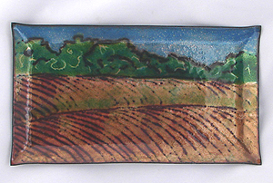 ![]() “Green Way” $83.00 9″ long Glass Enameled Tray “Looking out across the field and seeing the lines that the plows had made at planting time” |